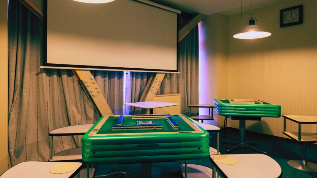 集中しながらも笑顔が絶えない、程よい緊張感と楽しさが広がる麻雀ルーム。